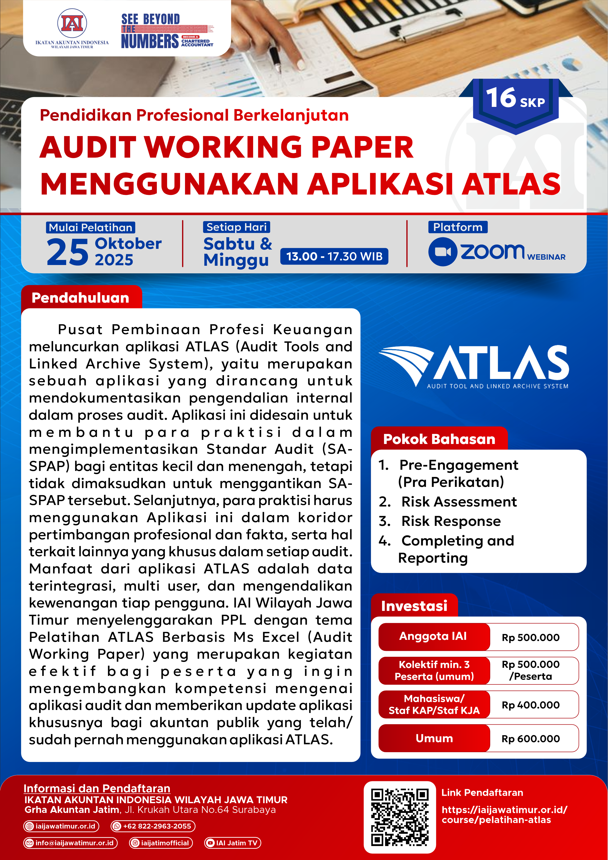 Pusat Pembinaan Profesi Keuangan meluncurkan aplikasi ATLAS (Audit Tools and Linked Archive System), yaitu merupakan sebuah aplikasi yang dirancang untuk mendokumentasikan pengendalian internal dalam proses audit. Aplikasi ini didesain untuk membantu para praktisi dalam mengimplementasikan Standar Audit (SA-SPAP) bagi entitas kecil dan menengah, tetapi tidak dimaksudkan untuk menggantikan SA-SPAP tersebut. Selanjutnya, para praktisi harus menggunakan Aplikasi ini dalam koridor pertimbangan profesional dan fakta, serta hal terkait lainnya yang khusus dalam setiap audit. Manfaat dari aplikasi ATLAS adalah data terintegrasi, multi user, dan mengendalikan kewenangan tiap pengguna. IAI Wilayah Jawa Timur menyelenggarakan PPL dengan tema Pelatihan ATLAS Berbasis Ms Excel (Audit Working Paper) yang merupakan kegiatan efektif bagi peserta yang ingin mengembangkan kompetensi mengenai aplikasi audit dan memberikan update aplikasi khususnya bagi akuntan publik yang telah/ sudah pernah menggunakan aplikasi ATLAS.