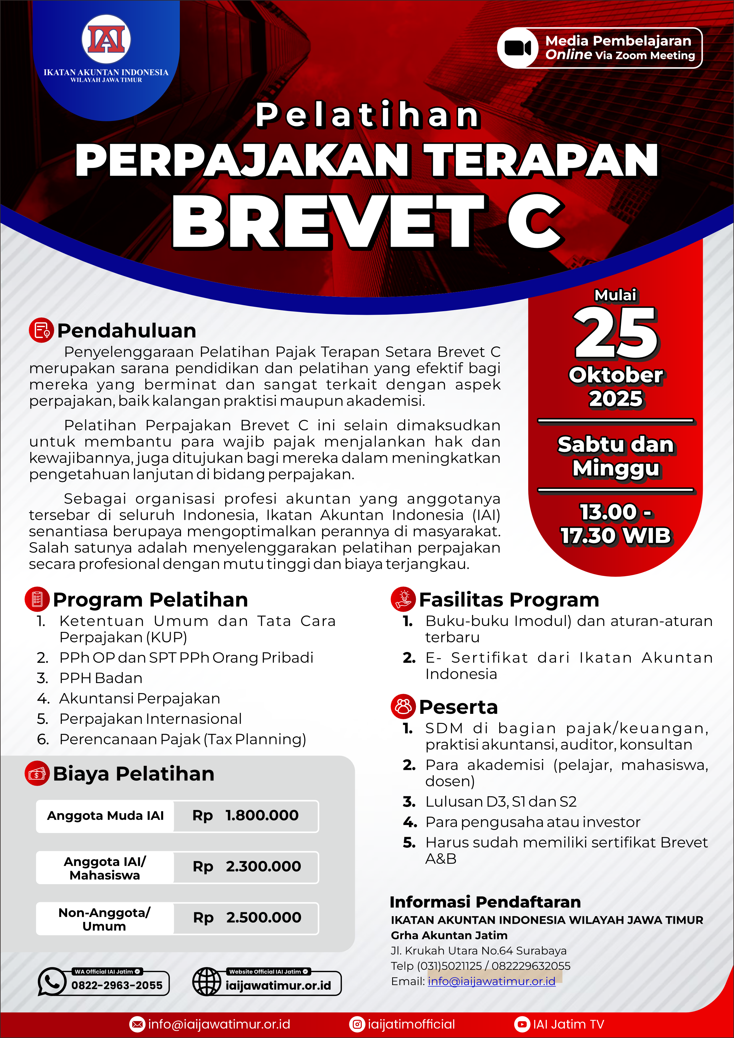 Sebagai organisasi profesi akuntan yang anggotanya tersebar di seluruh Indonesia, Ikatan Akuntan Indonesia (IAI) senantiasa berupaya mengoptimalkan perannya di masyarakat. Salah satunya adalah menyelenggarakan pelatihan perpajakan secara profesional dengan mutu tinggi dan biaya terjangkau.
